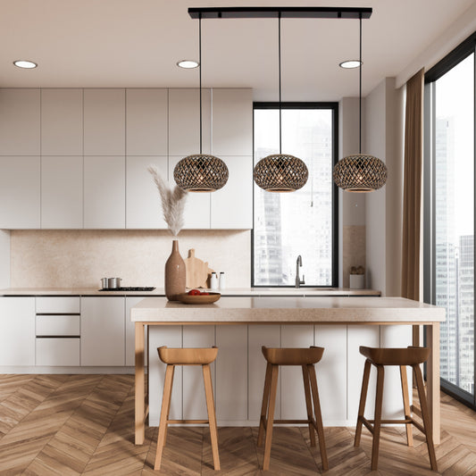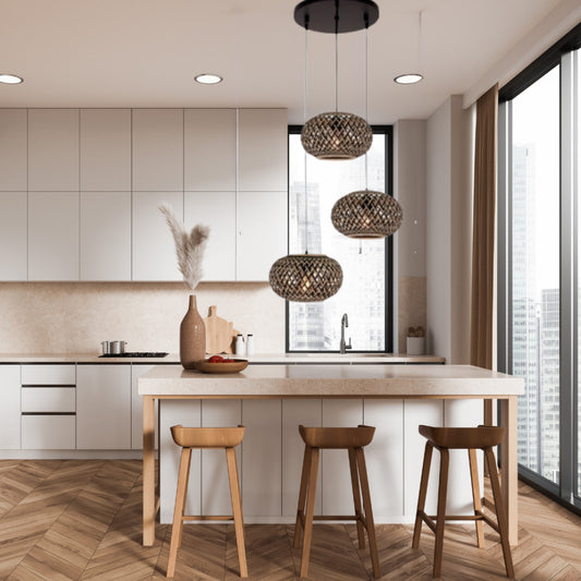 Various Weaving Hanglamp - 3 lichts - E27 - Bamboe - Ø28cm - 3 Hoogtes met Kappen - Nature